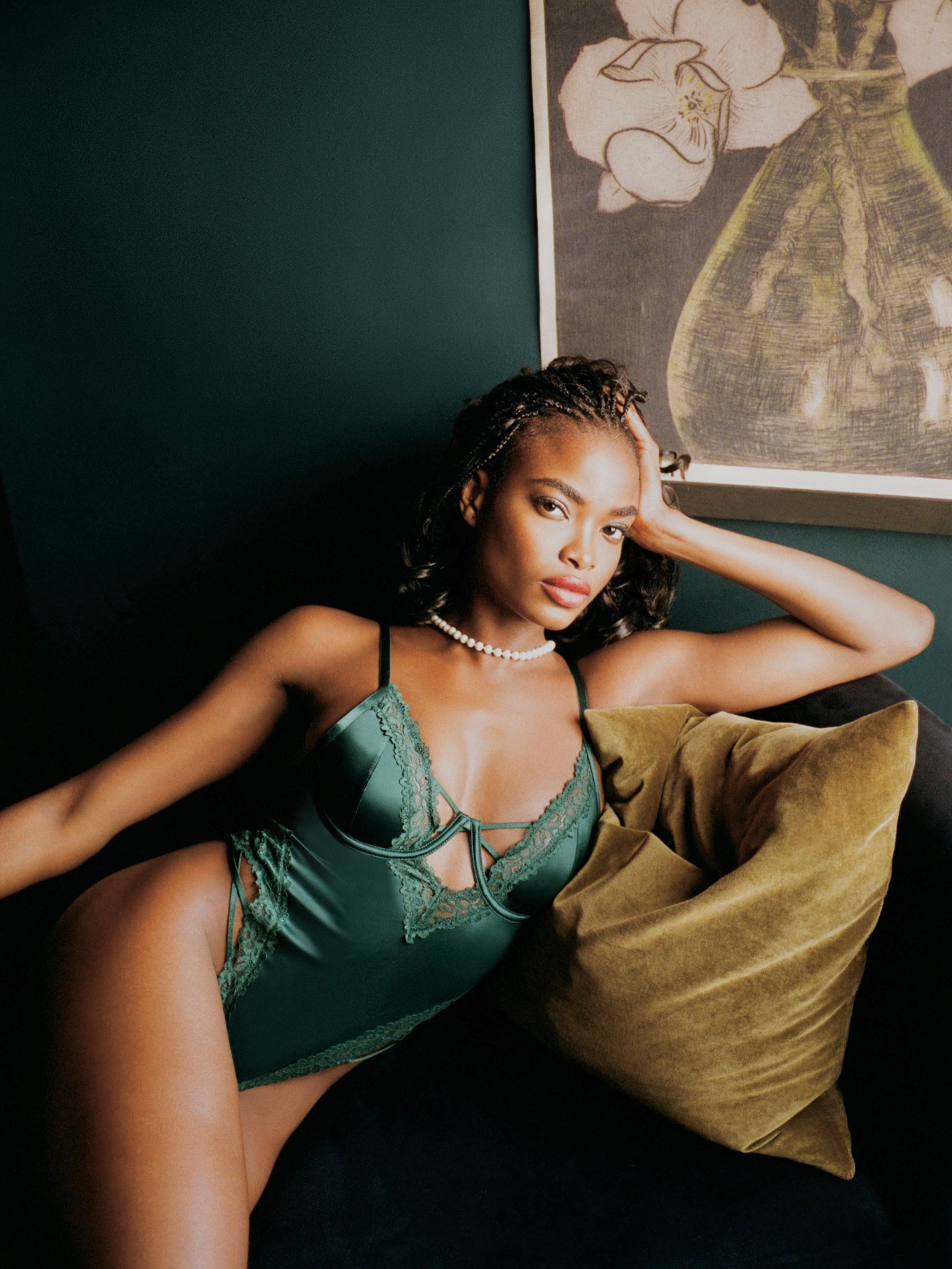 - STRETCH SATIN TEDDY WITH LACE TRIM AND FAUX LACE UP DETAIL