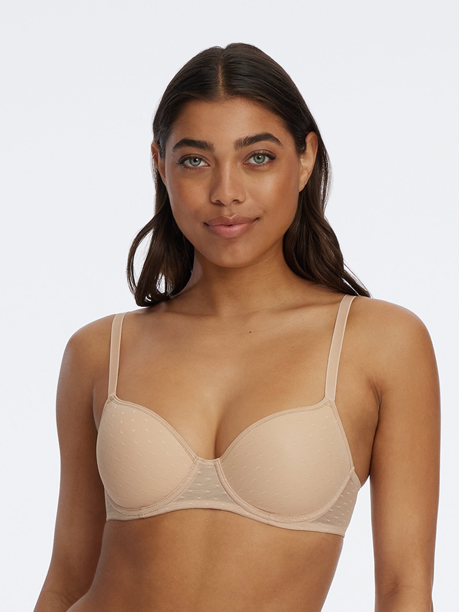 Experience ultimate comfort, style, and understated sensuality with our Dotted lace T-shirt bra. Its captivating layered dotted lace is non-see-through, giving you confidence all day.