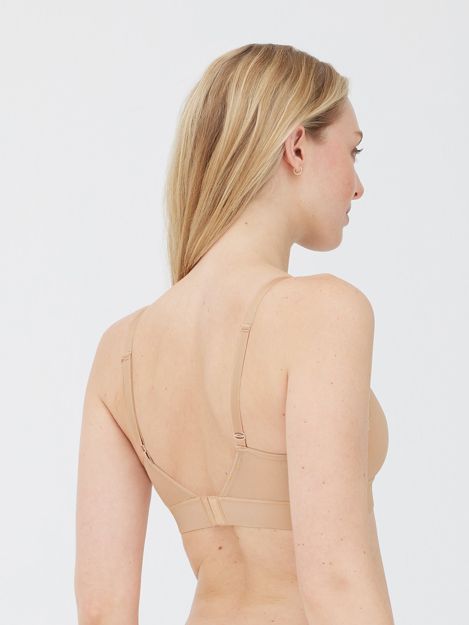 Designed to create a sexy and barely-there feel, the wireless bra features breathable lightweight mesh and feminine lace trims.