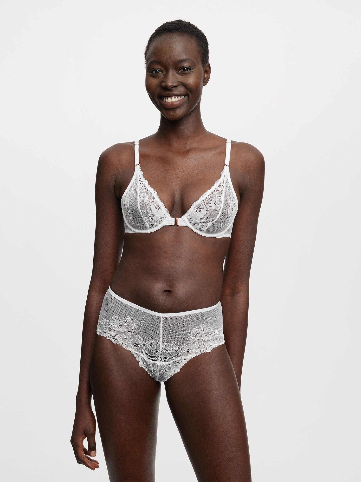 Flaunt your flirt. Feel confident and feminine in this high rise thong. With a beautiful floral lace and playful sheer mesh cutouts, we've got your date night covered. Complete the look with the Flaunt Front Close Lace Bra.
