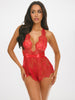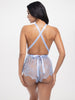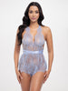 • EYELASH LACE ROMPER WITH OPEN BACK AND WRAP AROUND ROULEAU STRAPPING DETAIL
