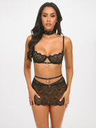 This is the quintessential lingerie ensemble. The Pearla consists of a 3-piece lace bra and matching skirtini, both embellished with a pearl-adorned lace choker. This luxurious set exudes sensuality, elegance, and refinement.