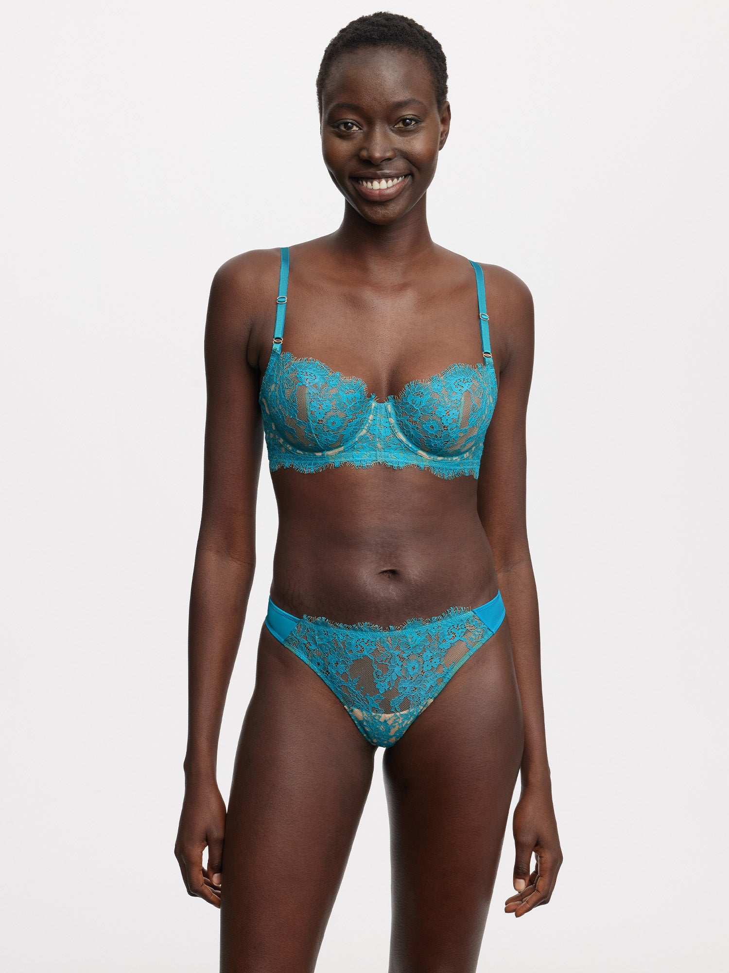 • Unlined, underwire with balconette lace cups.